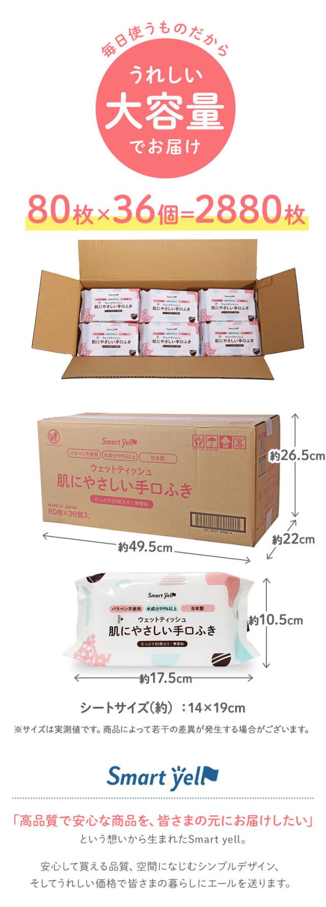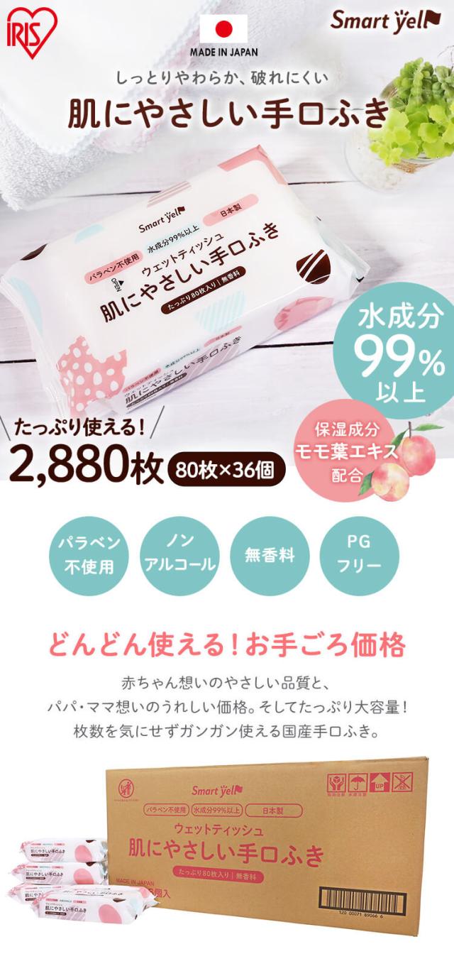 【1個あたり98円!】 ウェットティッシュ 手口ふき 日本製 赤ちゃん 赤ちゃん 肌にやさしい手口ふき 80枚入り 36個セット パラベン不使用 日本製 ノンアルコール 無香料 PGフリー 水99.9% 大容量 まとめ買い smart yell 送料無料