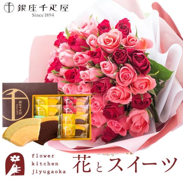 花とスイーツのセット バラ50本花束「ピンク×レッド」バイカラーラッピング+【銀座千疋屋】 銀座フルーツクーヘンセット プレゼント 誕生日 記念日 お祝い花 即日発送 あすつく メッセージカード FKAASW