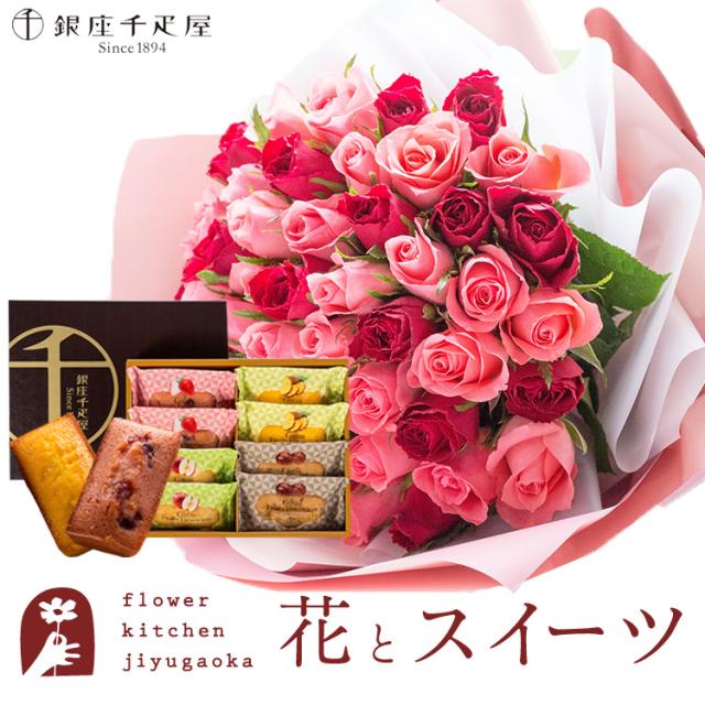 花とスイーツのセット バラ50本花束「ピンク×レッド」バイカラーラッピング+【銀座千疋屋】フルーツフィナンシェセット プレゼント 誕生日 記念日 お祝い花 即日発送 あすつく メッセージカード FKAASW