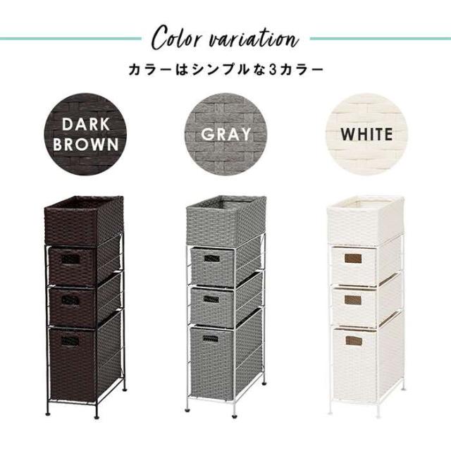 チェスト 引き出しタイプ。引き出し3杯、幅20.5cm。カラーは、ホワイト(4934257248099:2101775400・RAN-2406WH)、ダークブラウン(4934257248082:2101775300・RAN-2406DBR)、グレー(4934257270755:2101929400・RAN-2406GY)、です。チェスト。通気性の良い、引出しで水回りの収納もバッチリ。アジャスター付。カゴ部内寸:約幅17×奥行37×高さ13cm。引出し内寸(浅):約幅15×奥行37×高さ13cm。引出し内寸(深):約幅15×奥行37×高さ26cm。
