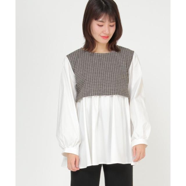 ジャカード生地と白ブラウスのドッキングトップス。