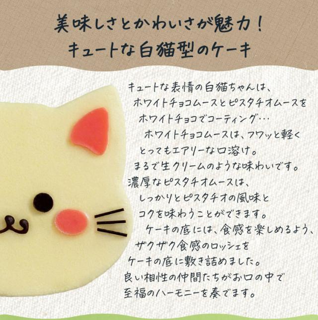 キュートな表情の白猫ちゃんは、ホワイトチョコムースとピスタチオムースをホワイトチョコでコーティング…