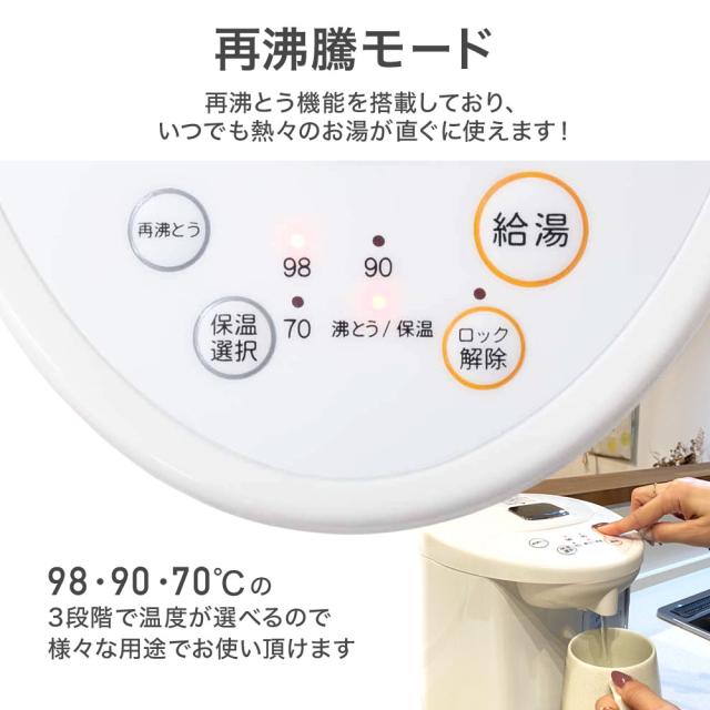 保温中のお湯を再び再沸騰させることでいつでも熱いお湯が出ます。