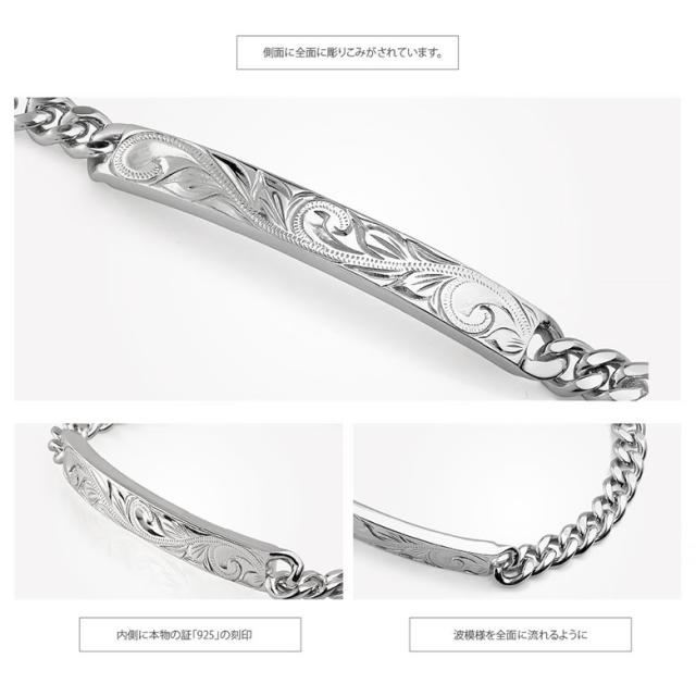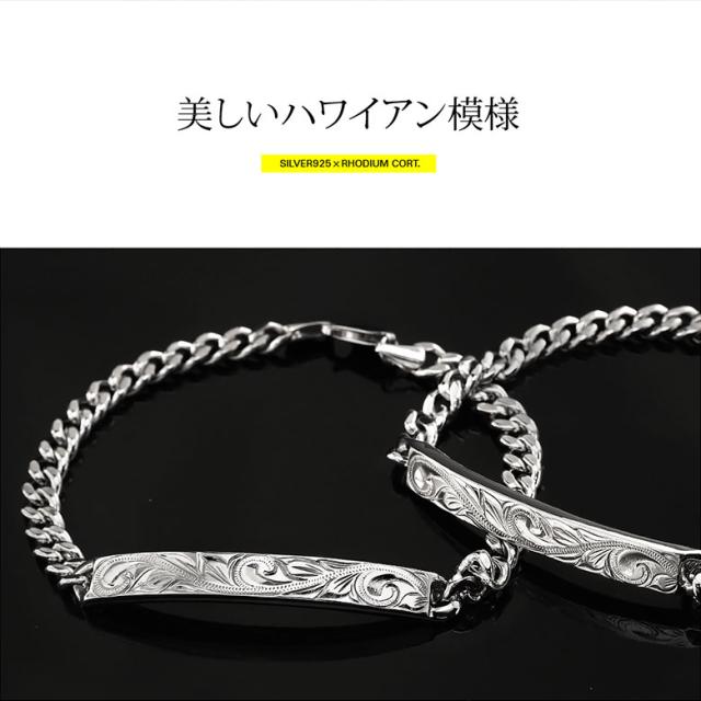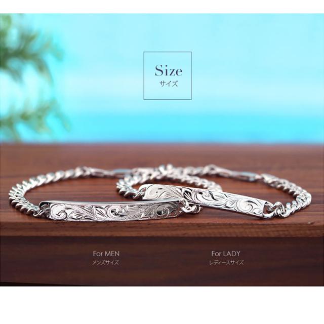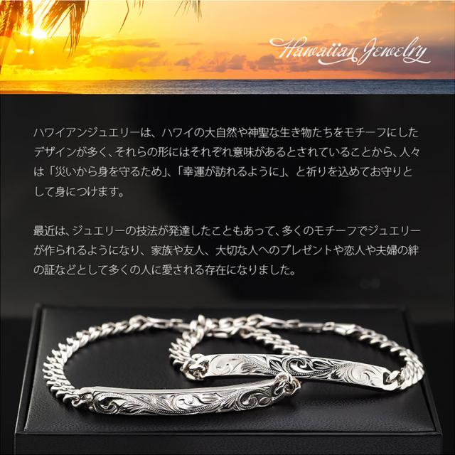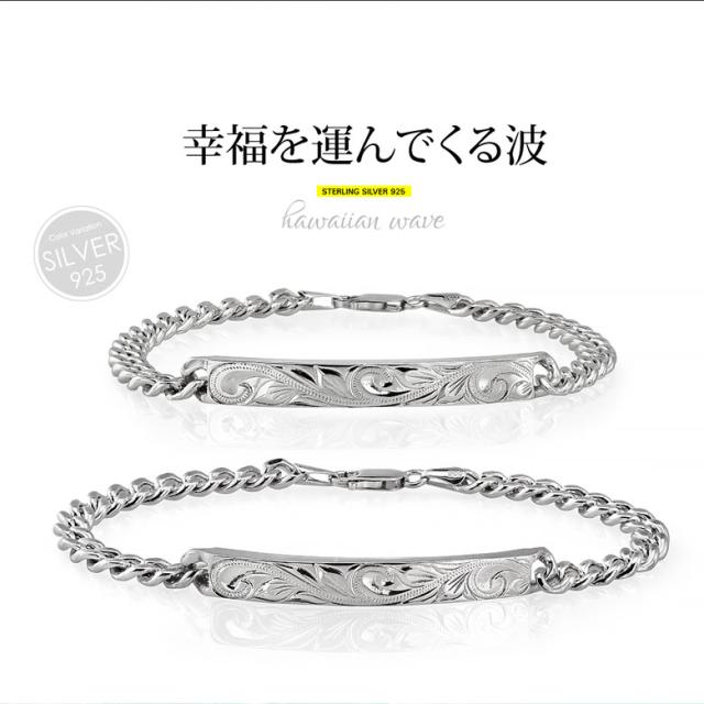 シンプルなプレートに波をデザインしたスクロール模様が一面に彫り込まれたシルバー925製のハワイアンペアブレスレットです。ハワイアンジュエリーの模様には意味が込められており、ファッションのデザイン性だけでなく、お守りとしても使われています。寄せては返す波には途切れることのない愛や、幸せを運ぶ波という想いが込められています。プレートの両側は美しい形が魅力の喜平チェーンで留め具には人気のカニ手型のロブスターフックを使用しています。(こちらのブレスレットはメンズサイズとレディースサイズのペアセットでの販売となります)