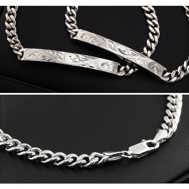 【サイズ】 全長(メンズ):19.5cm 全長(レディース) :17.5cm プレート部分の長さ :4cm 重さ:14.8g プレート部分の厚み :6mmチェーンの幅 :5mm (重さはレディースサイズを計測) 【ペアセット売り】