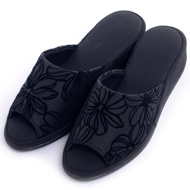 甲に花柄のフロッキーをあしらい、ヒールが付いた日本製スリッパです。