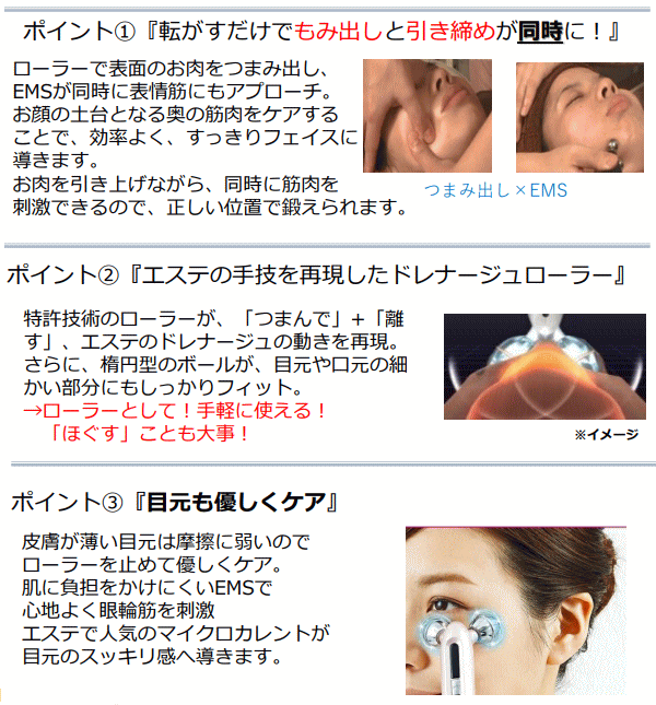 ローラーリフト 美顔ローラー 美顔器 EMS 低周波 中周波 表情筋 振動 バイブレーション ドレナージュ フェイスライン 目元 マイクロカレント 首 デコルテ ドレナージュローラー 防滴 お風呂 防水