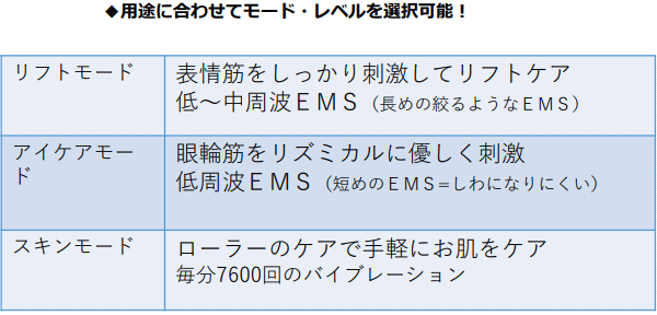 EMS&振動バイブレーションでフェイスラインと目元のケアが可能な家庭用美顔器。リフト、フェイス、スキンの3つのモードを搭載!部位に合わせたこだわりのアプローチ。特許取得のドレナージュローラー!首やデコルテのケアにもおすすめです。防滴仕様(IPX4)なので、お風呂でも使用できます。軽量・コンパクトなので、持ち運びも便利です。