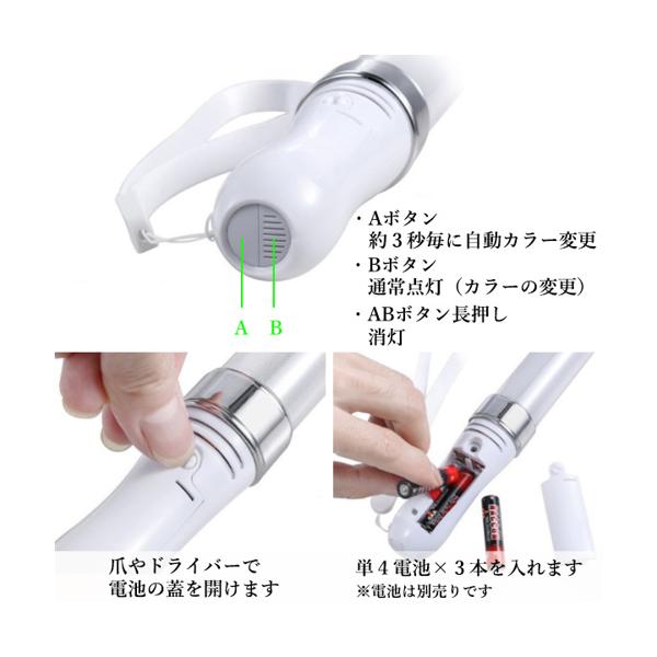 - かなり安くて心配していましたが、シンプルで届くのも早く大満足です。 特に赤と青は3色似た色があり微妙な違いは判断しにくいかも知れません(推しが水色なのですがいつも迷っていますw) 操作はAを1回押してONにすると色が自動で切り替わりますが、Aを何回か押して目的の色にするとそこからは色は変わりません。 また電源オフはA、Bどちらかを長押しでできます。