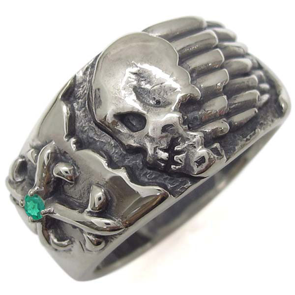 5月誕生石エメラルドを一粒使用した、シルバー製スカル(骸骨)&クロス(十字架)モチーフメンズリング(指輪)です。