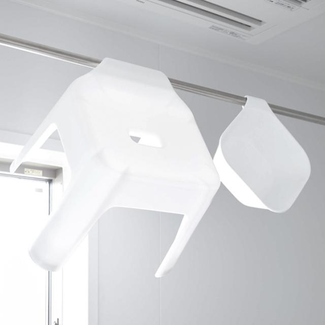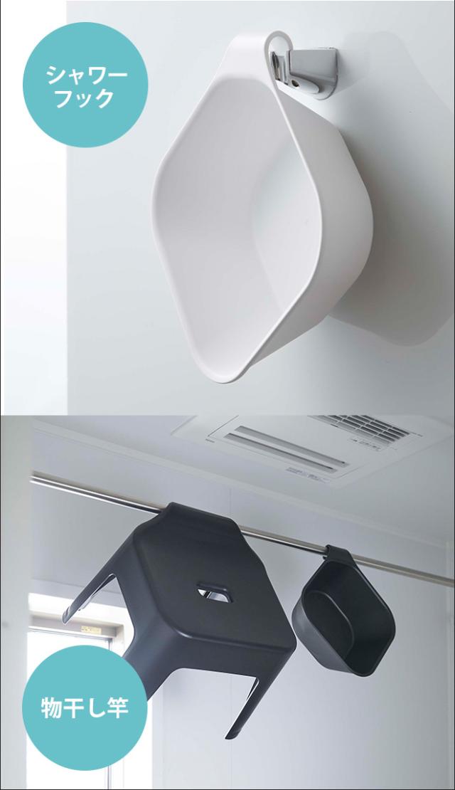フック付き風呂イス&湯おけなら、浴室のタオルバーなどに掛けて乾かせるので衛生的!