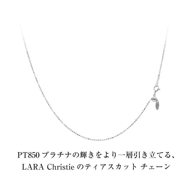 LARA Christie プラチナムコレクションのネックレスチェーン。pt850プラチナカットボールチェーン。シンプルにそのまま着ければデコルテにアクセントにもなり、お手持ちのネックレスと重ね付けすれば上級オシャレを演出します。同じペンダントトップでも、チェーンを変えるとまた違った雰囲気になるので、お手持ちのペンダントトップの替えチェーンにもお勧めです。プレート部分には、「pt850」の刻印が有り、素材と品質の良さも証明。オフィスシーン、フォーマルシーンに合わせやすい、使い勝手のよいチェーンです。
