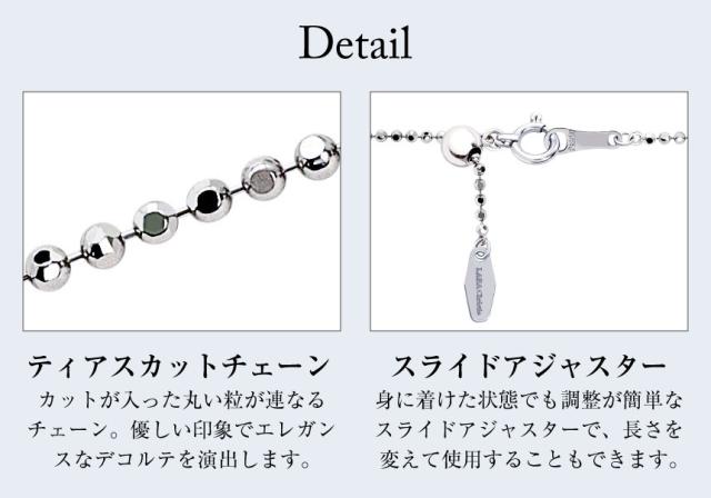 チェーンネックレスはスライドアジャスターになっているので、最大45cmまで自由な長さで調節可能。チョーカーとして、ネックレスとして、お好みの長さに調整してお楽しみください。
