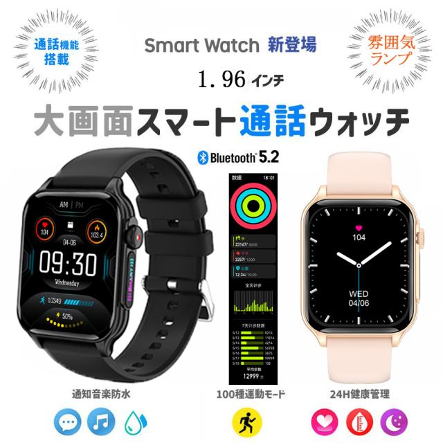 スマートウォッチ 最新作 音声通話 心拍計 血圧計 活動量計 歩数計 睡眠測定 1.96インチ 大画面 歩数計 RoHS認証 andriod IPHONE 男女兼用