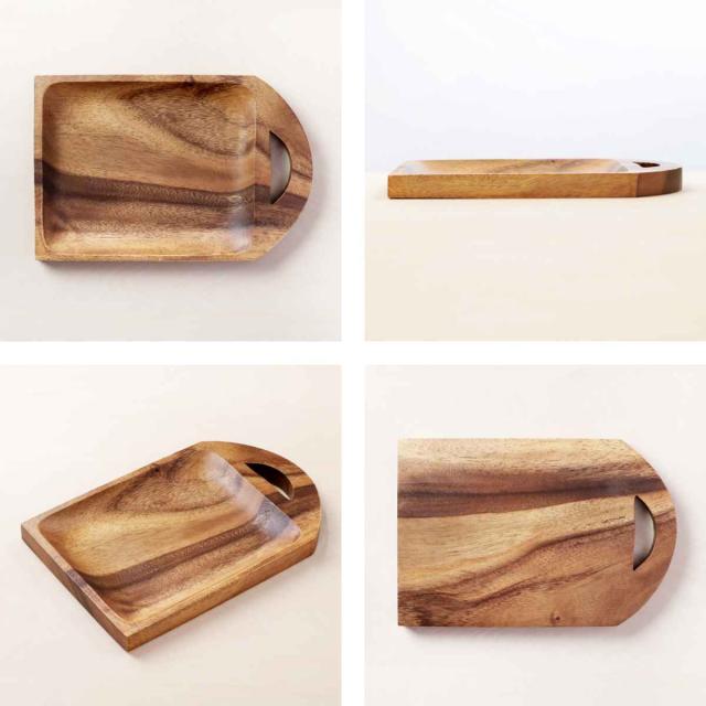 アカシアの質感をそのまま活かし、あたたみのある風合いに仕上げたアカシア食器シリーズ。アカシアのくり抜きのみを使用しているので耐久性も高く、長くご使用いただけます。プレートやランチプレート、ボウル、カッティングボードなど、形や大きさのバリエーションも豊富です。木目の温もりある表情が、食卓を優しくお洒落な雰囲気にしてくれます。