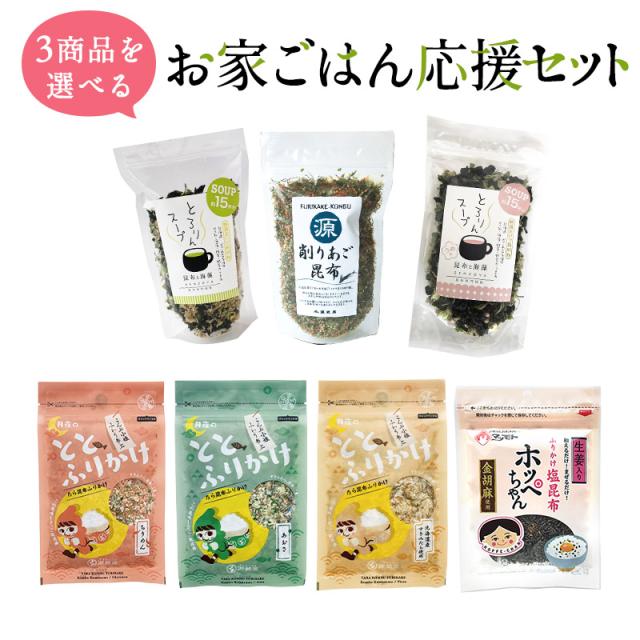 とろりんスープ・ととふりかけ・塩昆布ふりかけ・あごふりかけからお好きな3つを選べるお得なセットです!