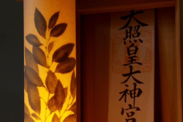 お供えの榊は、提灯などに使われる和紙風素材に描かれた「絵画」。生花のように交換やお水を入れる必要のない、新しい飾り方。