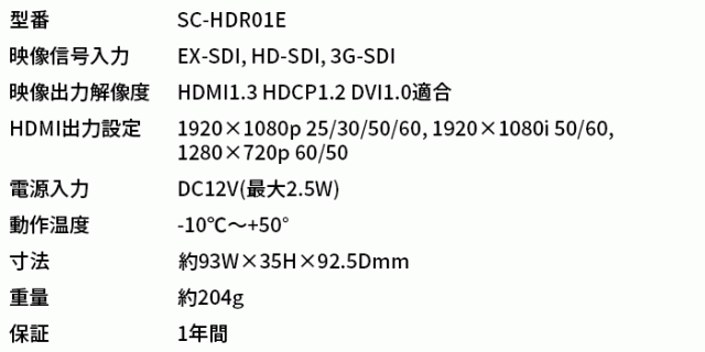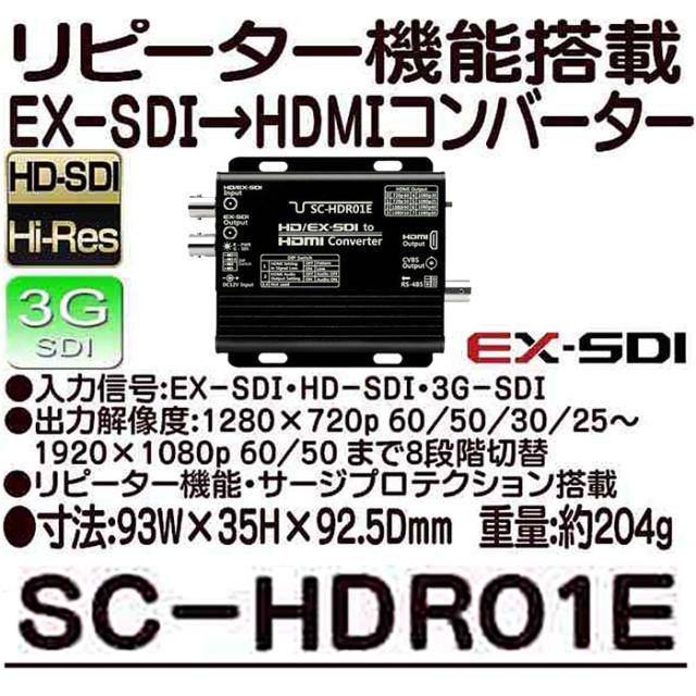 SC-HDR01Eは、EX-SDI・HD-SDI・3G-SDIカメラの映像をHDMIに変換する映像コンバーターです。