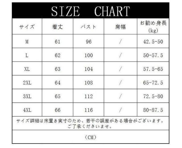 | サイズについての説明 | 【カラー】ホワイト ブラック 杏色 ブルー 【サイズ】M L XL 2XL 3XL 4XL 【ご注意】 ※お客様のご覧になられますパソコン機器及びモニタ、また室内、室外での撮影により実際の商品素材の色と相違する場合もありますのでご了承下さい。 ※サイズ詳細は床置き実寸のため、若干の誤差がある場合がございます。ご了承下さいませ。 |