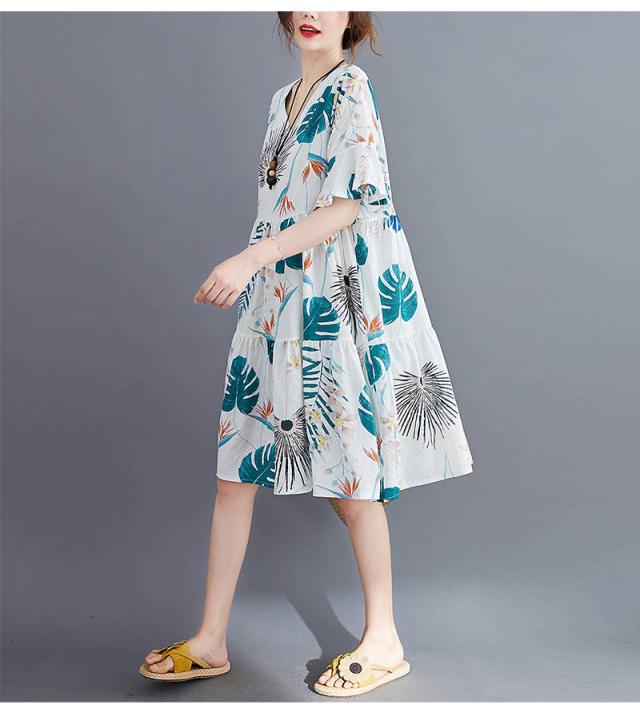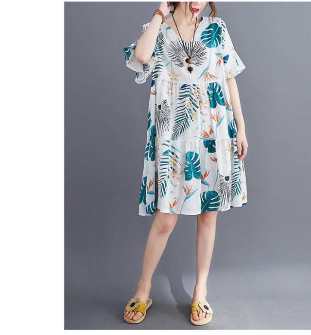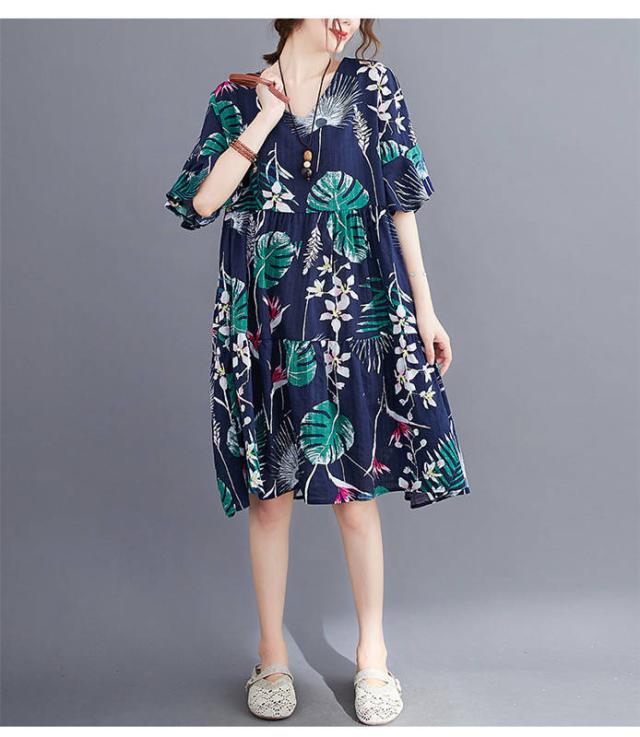 ワンピース レディース 夏 膝丈 半袖 体型カバー 美脚 aライン 花柄 ドッキング vネック ハイウェスト コットン 海遊び 新作 ゆったり 50代 40代 30代
