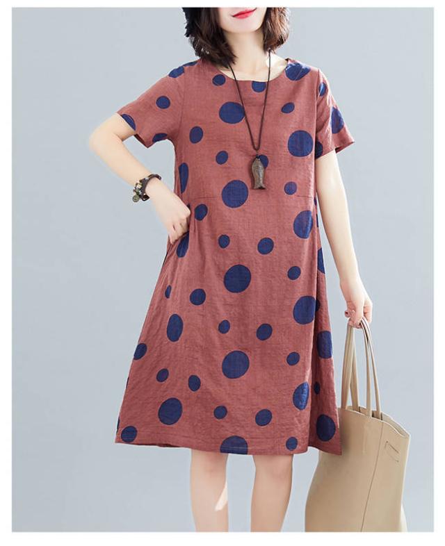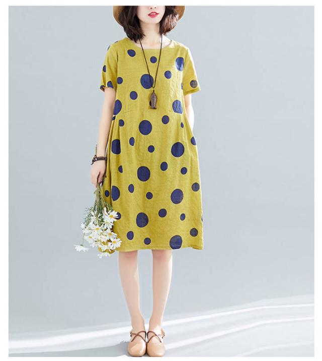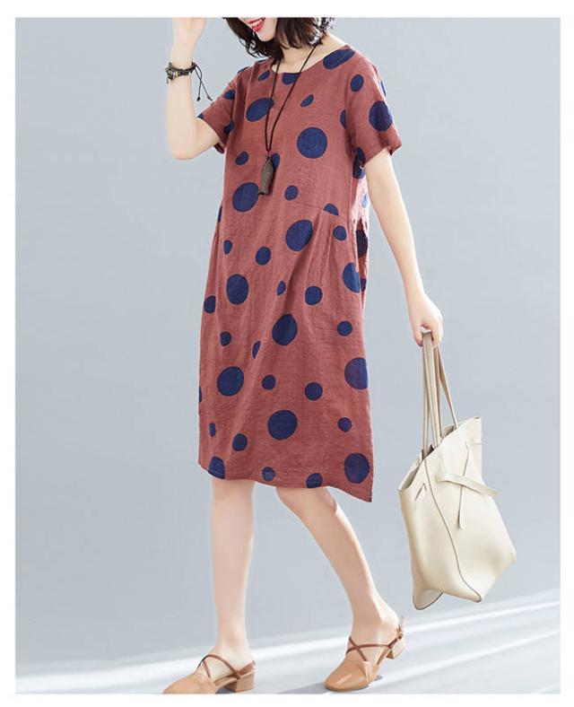 ワンピース ワンピ レディース 夏 膝丈 半袖 体型カバー 美脚 aライン ポケット付き 綿麻 ハイウェスト ドット ドッキング 新作 ゆったり 大きいサイズあり