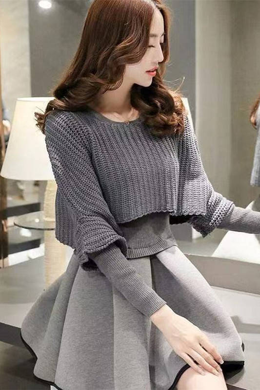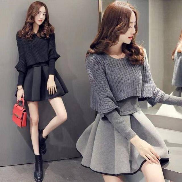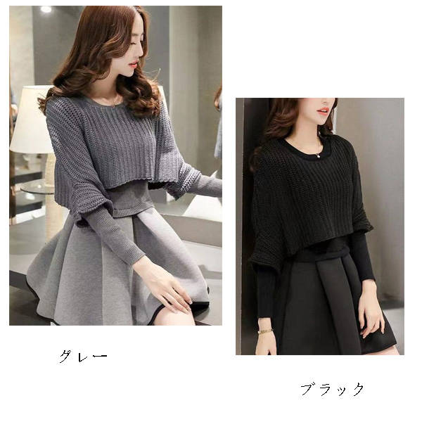 ニットセット レディース ショット丈 ドルマンスリーブ マント式 プルオーバー レイヤード ミニワンピース オシャレ 大人 春秋新作