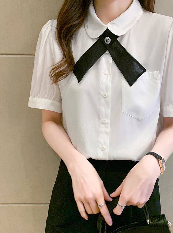 シャツブラウスレディース事務服半袖丸襟通勤制服ボウタイスーツインナーリボン付きビジネスオフィスホワイト