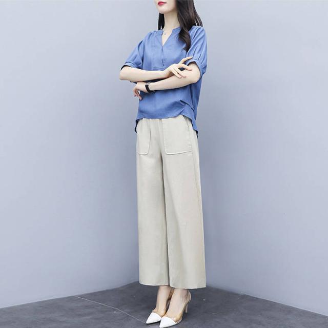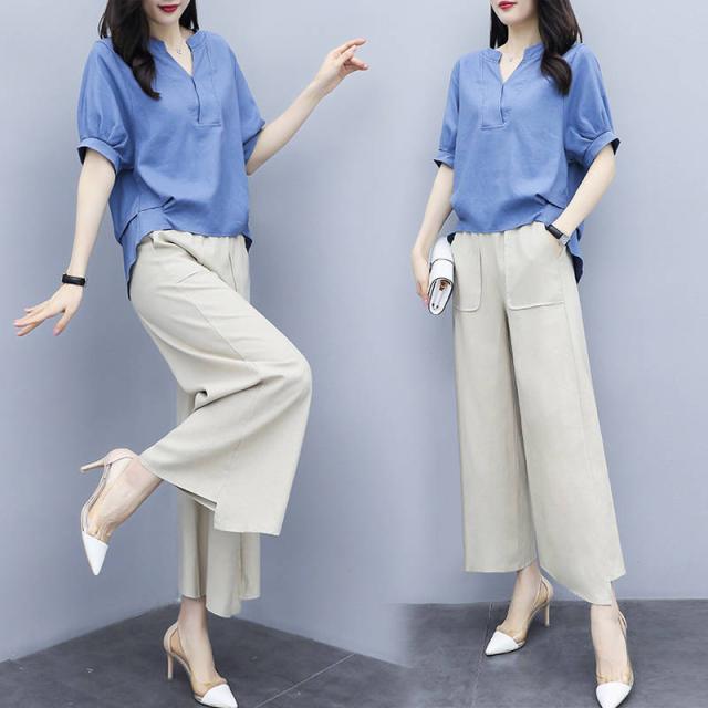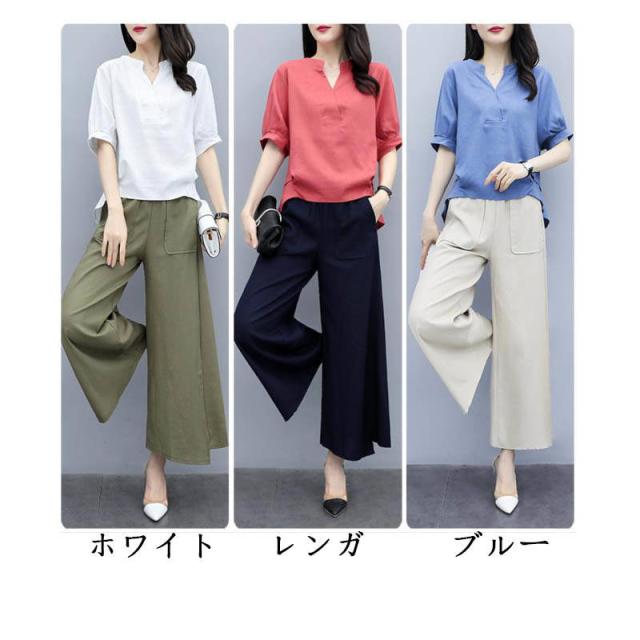 セットアップ レディース 春夏 オシャレセットアップ 半袖ブラウス Vネック九分丈ワイドパンツ リネン カジュアル 韓国風 通勤 40代 大きいサイズセット