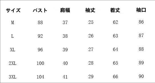 | サイズについての説明 | 【サイズ】:(約) *着丈:62cm(M) 63cm(L) 64cm(XL) 65cm(2XL) 66cm(3XL) *バスト:96cm(M) 100cm(L) 104cm(XL) 108cm(2XL) 110cm(3XL) *肩幅:37cm(M) 38cm(L) 39cm(XL) 40cm(2XL) 41cm(3XL) *袖丈:25cm(M) 26cm(L) 27cm(XL) 28cm(2XL) 29cm(3XL) *パンツ丈:86cm(M) 87cm(L) 88cm(XL) 89cm(2XL) 90cm(3XL) |