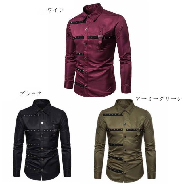 カジュアルシャツ メンズ トップス 長袖 スタッズ ボタンシャツ ゴシックスタイル 秋冬 スリム フィット かっこいい おしゃれ 個性派 光沢