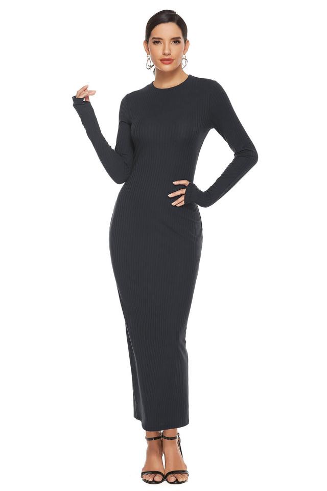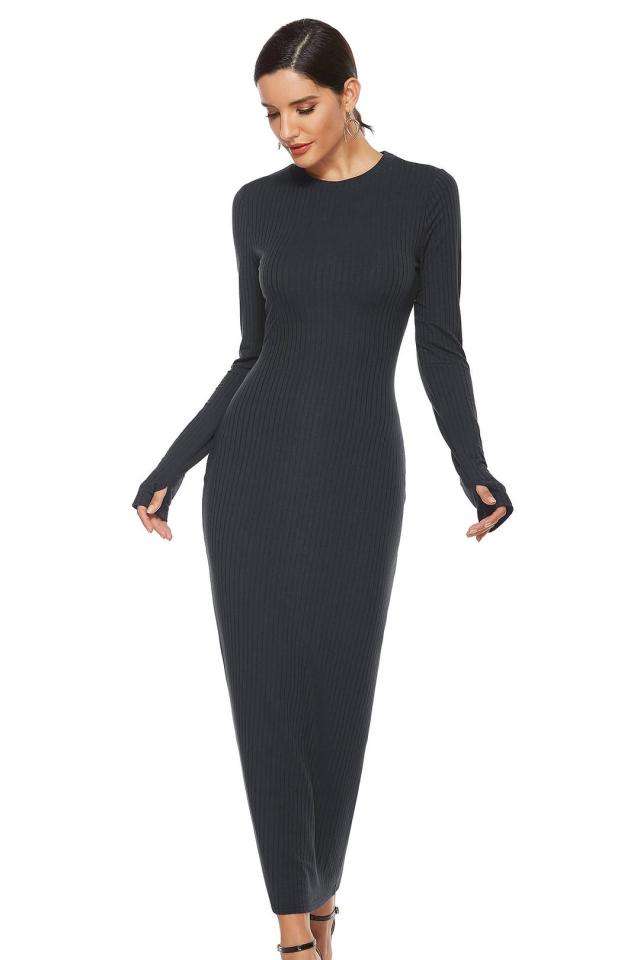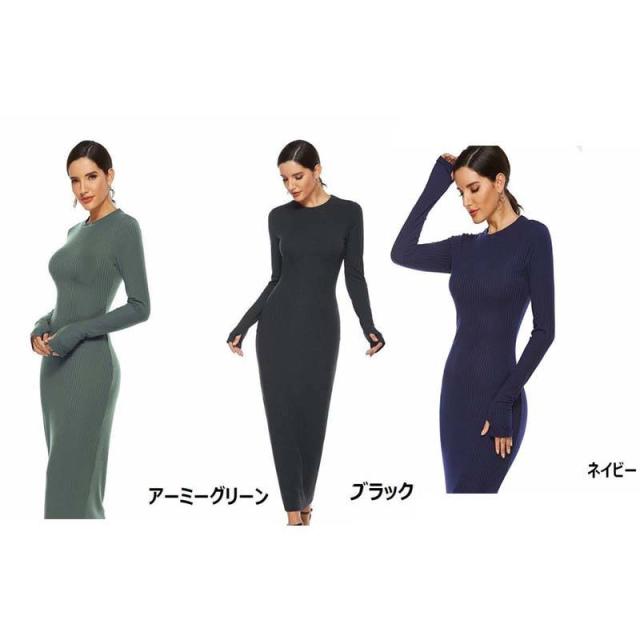 ワンピース レディース 婦人服 カジュアルドレス 長袖 ラウンドネック ロング丈 リブニット素材 指穴 シンプル 無地 タイト おしゃれ