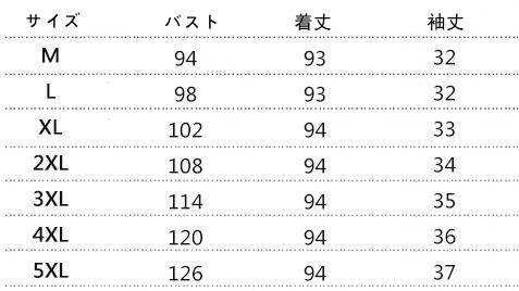 | サイズについての説明 | M 着丈93 バスト94 袖丈32 L 着丈93 バスト98 袖丈32 XL 着丈94 バスト102 袖丈33 2XL 着丈94 バスト108 袖丈34 3XL 着丈94 バスト114 袖丈35 4XL 着丈94 バスト120 袖丈36 5XL 着丈94 バスト126 袖丈37 |