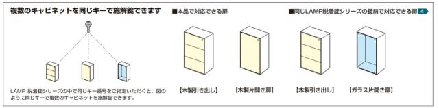LAMP脱着錠シリーズの中で同じキー番号をご指定いただくと、図のように同じキーで複数のキャビネットを施解錠可能。