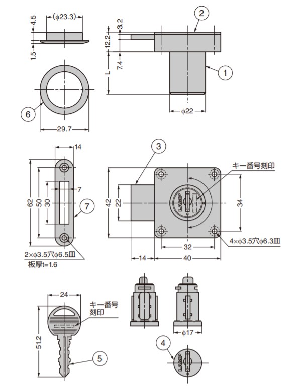 シリンダー脱着式 面付 シリンダー 錠 5830型 用 扉厚、シリンダー長さ調整用スペーサー 別売品 【説明】用途:取付面:鍵違い数:マスターキー:解錠時:対応タートルロック 引き出し片開き扉:木:3,120通り:780通り/1マスター:キーは抜ける:- シリンダー内筒が交換できる、マスターキー機能付面付シリンダー錠です。 キーの紛失や使用者の変更時に、シリンダー錠を本体ごと取り替える必要がないため、管理が大変容易です。 別売のマスターキーで一括管理もできます。 キーは抜き差し方向のないリバーシブルタイプです。 従来の面付錠に比べると、デッドボルトのストロ-クが長くなっています(当社比)。 製品内容は、部品としての品質範囲です。この部品を使用した最終製品の機能・性能・安全を保証するものではありません。 受注対応でシリンダーリング、シリンダー外筒のみ金色仕上もできます。 【注 意】 取扱い上のご注意を必ずご確認ください。 シリンダー内筒の取り外しには、チェンジキー5830-K1(別売品)が必要です。 シリンダー内筒のみのご注文は受注対応となります。 【付属品】 十字穴付皿木ねじ3.1×13、3.1×22(ステンレス鋼) キー シリンダー内筒 リング 受座 【取り外し方法】 チェンジキー(別売品)でシリンダー内筒を反時計回りに90度回転させます。 シリンダー内筒の○印とシリンダーケースの○印を合わせ内筒を抜きます。 【サイズ】厚さ:2 【注文コード】150-060-569 【品番】5830-SP 製品内容は、部品としての品質範囲です。この部品を使用した最終製品の機能・性能・安全を保証するものではありません。 ※画像はイメージです。 ※パッケージ、仕様、品番などの変更が予告なく変更される場合が御座います。 カテゴリー |