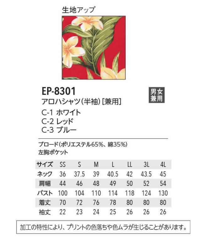 飲食サービス系ユニフォーム アルベ arbe チトセ chitose兼用 半袖アロハシャツ EP-8301 通年