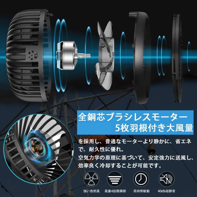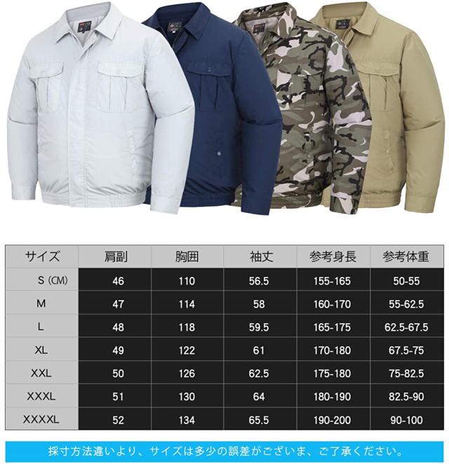 【セット内容】 空調服*1、扇風機*2、USB充電式ケーブル*1、電池*1、 電池は新開発5200mAH超大容量リチユウムバッテリー、外寸9.5*8*2.5cm、従来電池容量から23%以上の拡大、サイズから30%以上の軽量化を実現し、片手にも収めるコンパクトサイズ。電気安全に関する一般的な基準に加え、日本国厳しいPSE認証を受け取り、人体に危害がありません長期間安心してお使いいただけます。扇風機の風量が4段階と切り替えます。風量により使用時間は約7‐20時間になります(扇風機のモードにより異なります。)