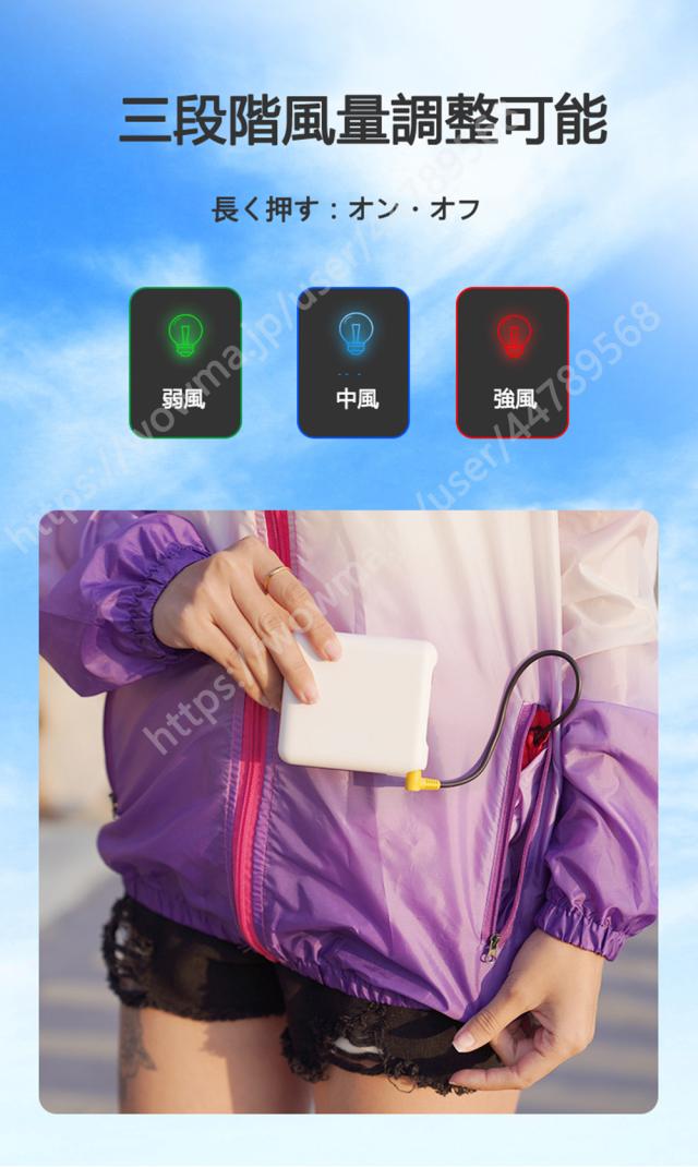 【強力送風・3段階調節】9枚羽根に増える強力大風量ファンを搭載し、大風量で涼しさもアップ!パワフルに風を送って、すぐに涼しい風が体表の巡るを感じます。「弱、中、強」の3段階風量調節可能なファンがモバイルバッテリーで給電され、複数バッテリーを用意すれば長時間使用可能です。