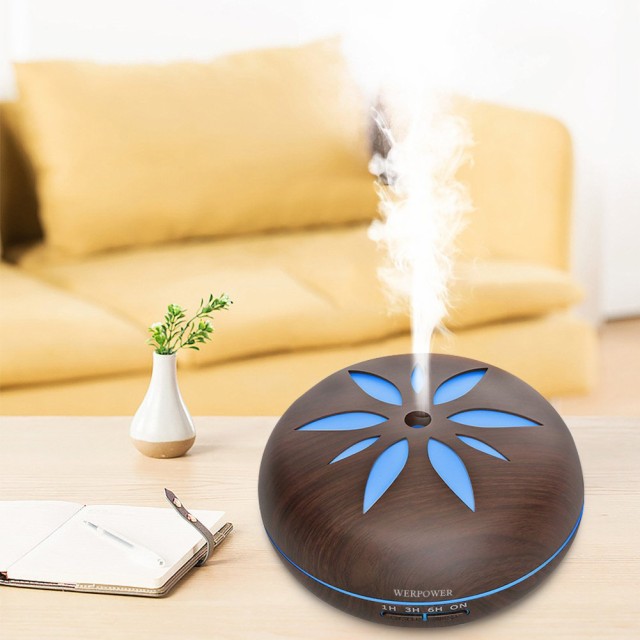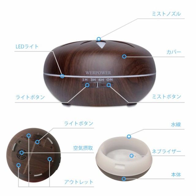アロマディフューザー 超音波式 卓上加湿器 7色変換LED搭載 550ml リモコン付き 木目調