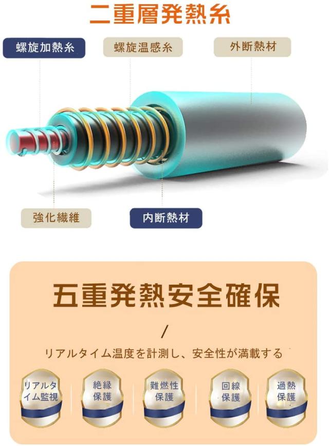 リアルタイム監視、絶縁保護、難燃性保護、回線保護、過熱保護の五重発熱保護がありますので、水洗い、洗濯機洗濯対応です。