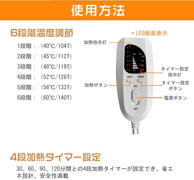 6段階の温度設定(40°C〜60°C)があり、4段階のタイミング設定(30分間〜120分間)できます。電源コードは最大220cmで、テーブルの下、ソファ、またはベッドの上に置くことができます。