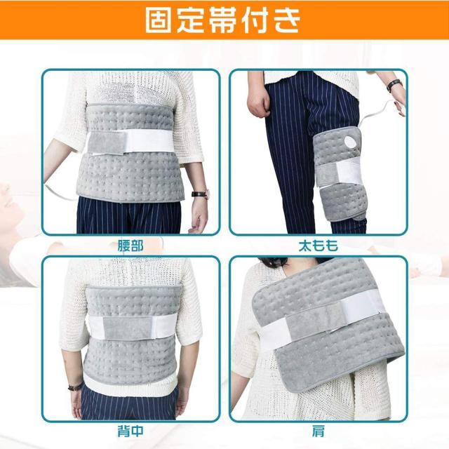 【使い勝手・固定帯付き】当製品は暖房器具としていろんな使い方があります。付属の固定帯を使って、腰や太もも、膝、背中、肩などに固定してご使用できます。電気カーペットが至る最高温度は60℃で、過熱防止のため、これを超えると自動的に保温状態になります