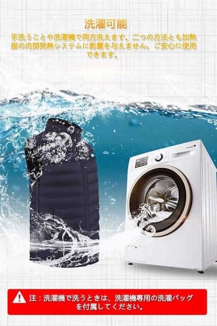 モバイルバッテリーを取り外し、中性洗剤を入れて手洗いを行います(洗濯機でも洗えます)。 洗濯機で洗うときは、洗濯機専用の洗濯バッグを付属してください。強くこすったり、たたいたりしてはいけない、衣服を自然に通風乾燥させてから使用してください。