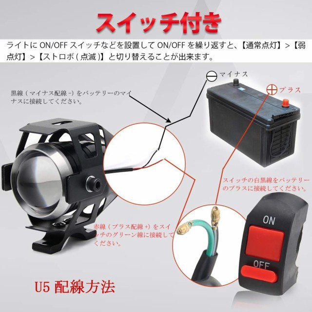 バイク汎用 LED フォグランプ スイッチ付き ストロボ機能 High/Lowビーム 補助灯 IP68防水 オートバイ オフロード アルミ 補助ライト