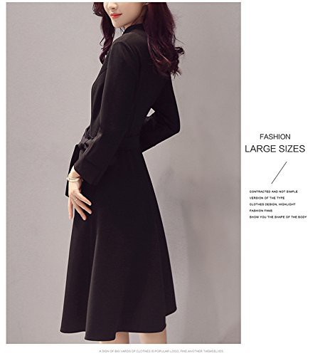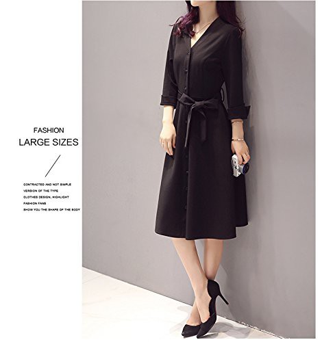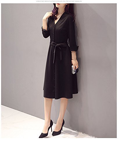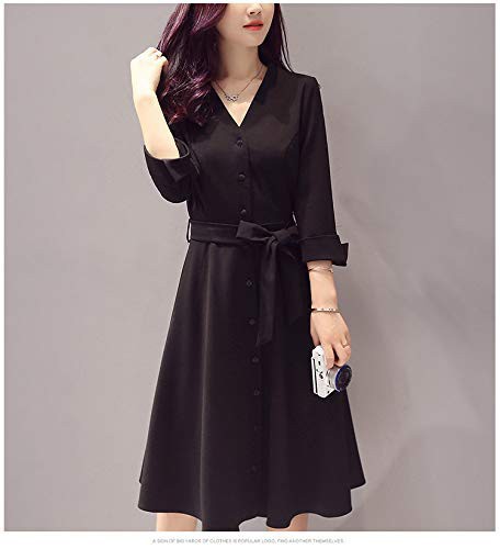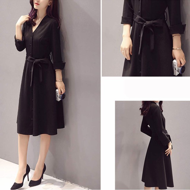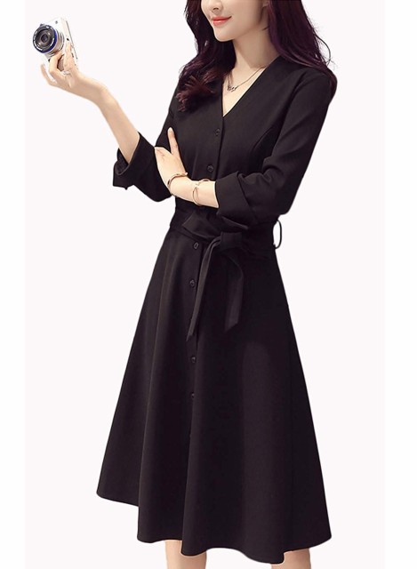 レディース ワンピース シャツワンピース チュニック 長袖 膝丈 秋冬 ドレス Vネック ひざ丈 無地 大きいサイズ ブラック 黒