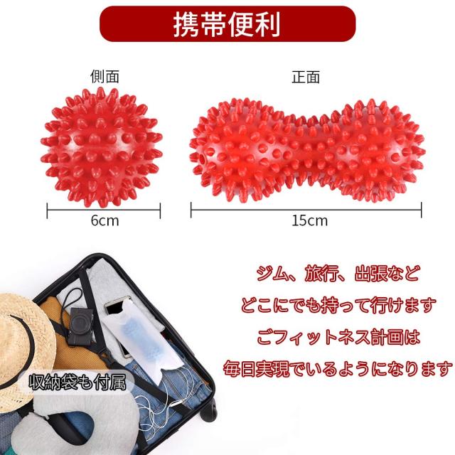 【携帯便利】素材:ナチュラルラバー 重量:156g サイズ:15 x 6cm ヨガボールは手軽に持ち運べるタイプで、家でも、オフィスでも、新幹線、機内などいろいろな所に使用できます。またマッサージボールが汚れたら、水洗えば、すぐ綺麗になります。