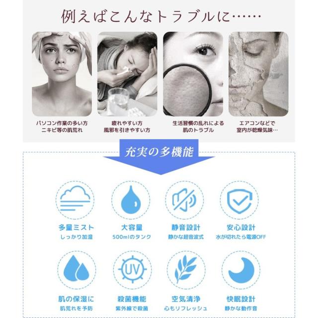 加湿器 卓上 大容量 500ml USB 美容 美顔 殺菌 空気浄化 静音設計 オフィス 寝室 赤ちゃん 風邪予防 乾燥対策 部屋加湿 節電 省エネ