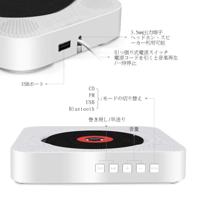 多機能CDプレイヤー:ポータブルCDプレーヤー/Bluetooth対応/USB対応/AUX入出力サポート1台4役です。CD再生だけでなく、Bluetooth搭載し、ワイヤレスでスマホなどのブルートゥース設備と接続でき、スマホなどの音楽を聞けます。USBもサーポートしております。Bluetoothモード/CDモード/USBモード/Audioモード、手軽に選択できます。※使用上のご注意:?本製品に付いているFMラジオ機能の対応周波数は87.5〜108.0MHzのため、日本ではご利用いただけません。?電源を入れるときには必ず5V/2Aアダプタをご利用ください。また、通電後、本機器を起動するために、電源ケーブルを下向きに軽く引かなければなりません。?リモコンをご利用する前には、後ろにある絶縁シートを取り外してください。