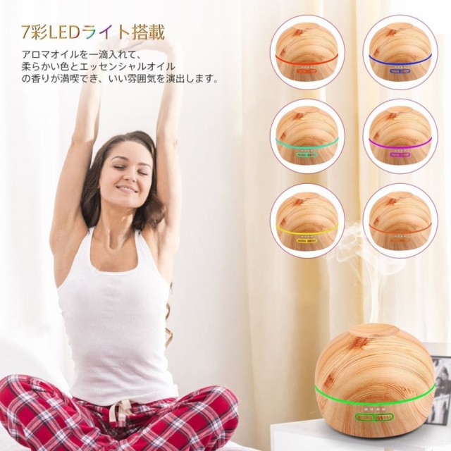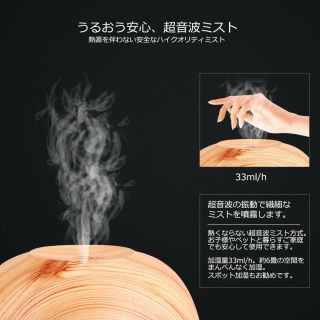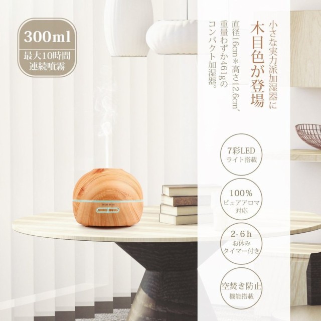 アロマディフューザー 加湿器 超音波式 卓上空気清浄機 アロマ加湿器 ムードランプ 空焚き防止機能搭載 時間設定 300ml
