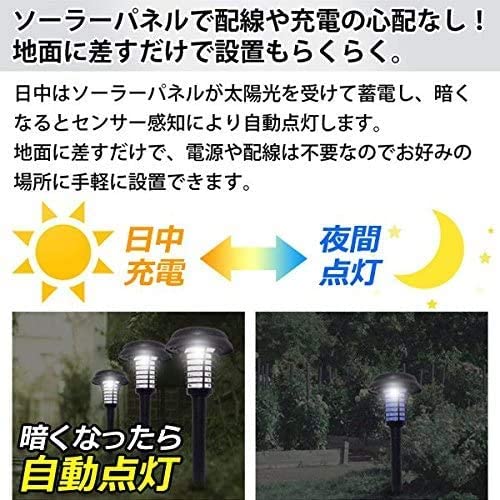 【殺虫器&照明ライト】この製品は電撃殺虫器ですけど、庭、裏庭など照明としていいです。優しいライト光で庭や小道、ガーデニング空間を照らし、省エネルギータイプのいい照明らいとです。そして、地面に挿すだけで、電源や配線は不要なのでお好みの場所に手軽に設置できます。