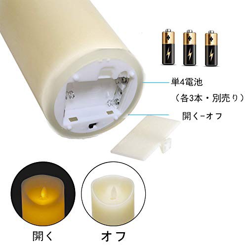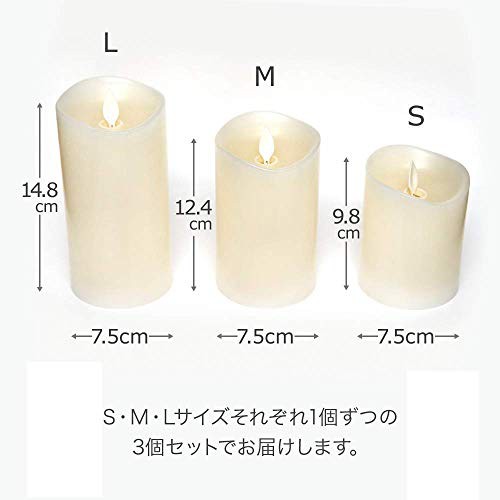 安全性:光はLEDによって生成され 火災による事故は心配ありません 触ったり倒してしまっても大丈夫。小さなお子さまやペットがいるご家庭でも安心 サイズ(約):L(直径8cm高さ15cm)、M (直径8cm高さ13cm)、S(直径8cm高さ10.5cm) キャンドル本体電池:単4電池(各3本・別売り) リモコン用電池:ボタン電池1個(付属) 適合:暖かく白い導かれたライトは暖かく、ロマンチックな雰囲気を作成します。素敵な生活を満喫しよう。 彼らは広くバレンタインの日に適用することができ、結婚式、誕生日、家の装飾、バー、ホテル、パーティー、休日、クリスマス、キャンプ、お寺 寺院、または他の機会に提案します。 注意事項:LEDランプの寿命は50,000時間以上です。次のようなヒントにもっと注意を払う限り、それは再利用可能です。 ※このろうそくは本